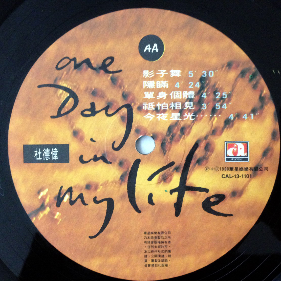主打歌 : 擦身情緣, 影子舞. Alex在華星最後一張大碟, 亦是他一個小小的高峰, 一快一慢的主打都受歡迎, "擦身情緣"柔和溫暖, 經過廿多年都不過時; "影子舞"加入Rap的元素, 比很多跳舞歌手行快少少, 歌詞寫得有特色. 華星80年代尾開始高層多次變動, 先是呂方離開, 輪到杜德偉, 他91年跳槽華納, 國語歌方面則簽滾石, 在台灣發展逐漸比香港成績更好. 其實, 杜德偉在華星由87年到90年的大碟比較精致, 包括這張"One Day In My Life", 值得回味.